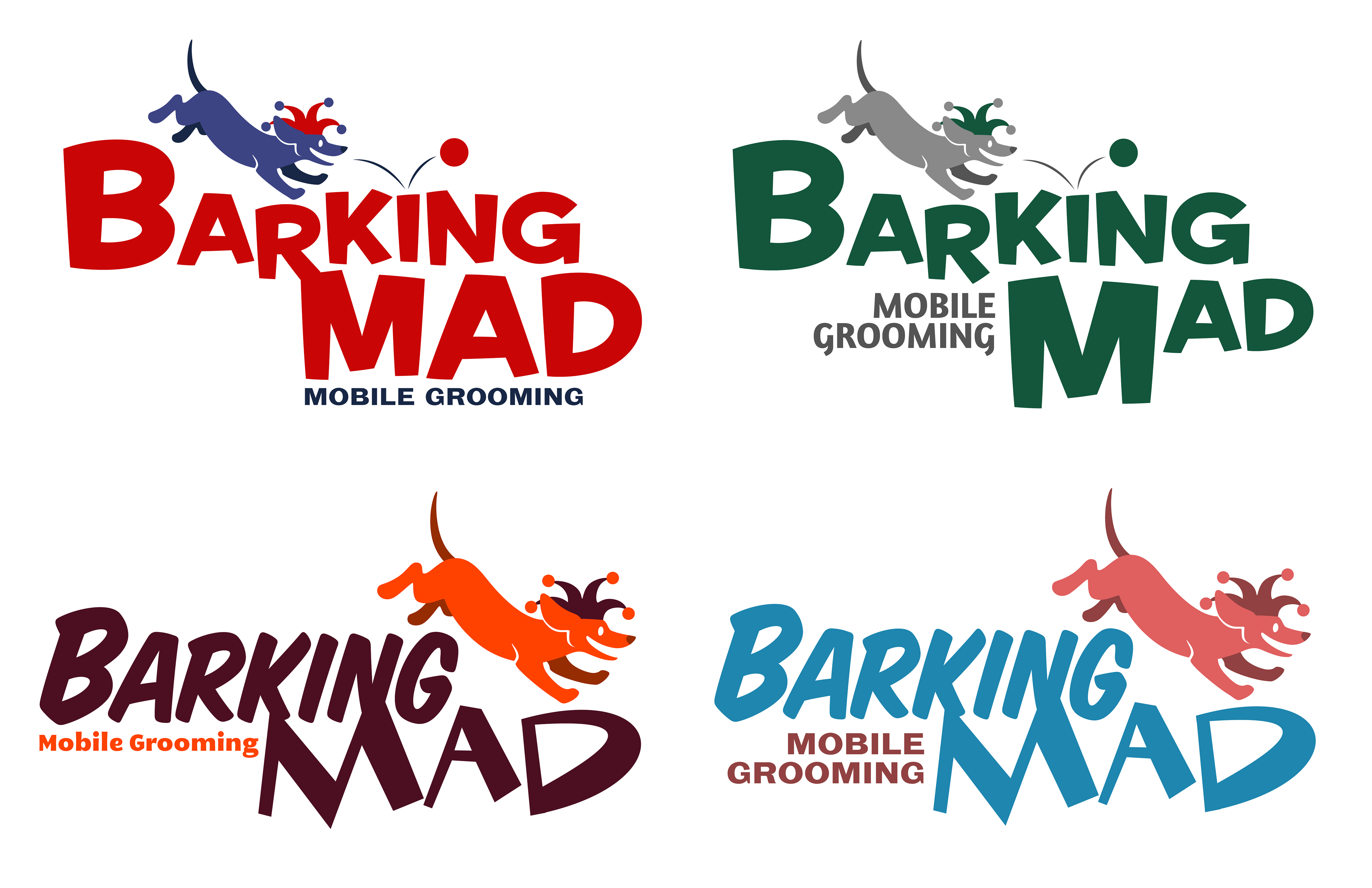 Designed for a mobile pet grooming business, this logo features a dachshund jester chasing the bouncing tittle of the "i." The logo is used for online and print marketing.